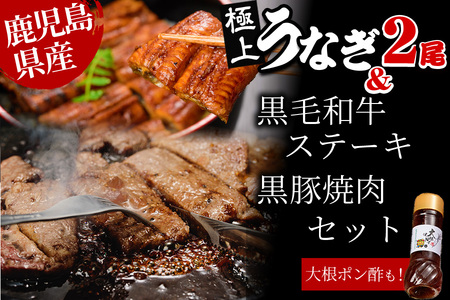 鹿児島県志布志市 鹿児島自慢3点セット(うなぎ・黒毛和牛サーロインステーキ・黒豚肩ロース)合計約1.1kg e7-004 57,000円 出典:ふるなび