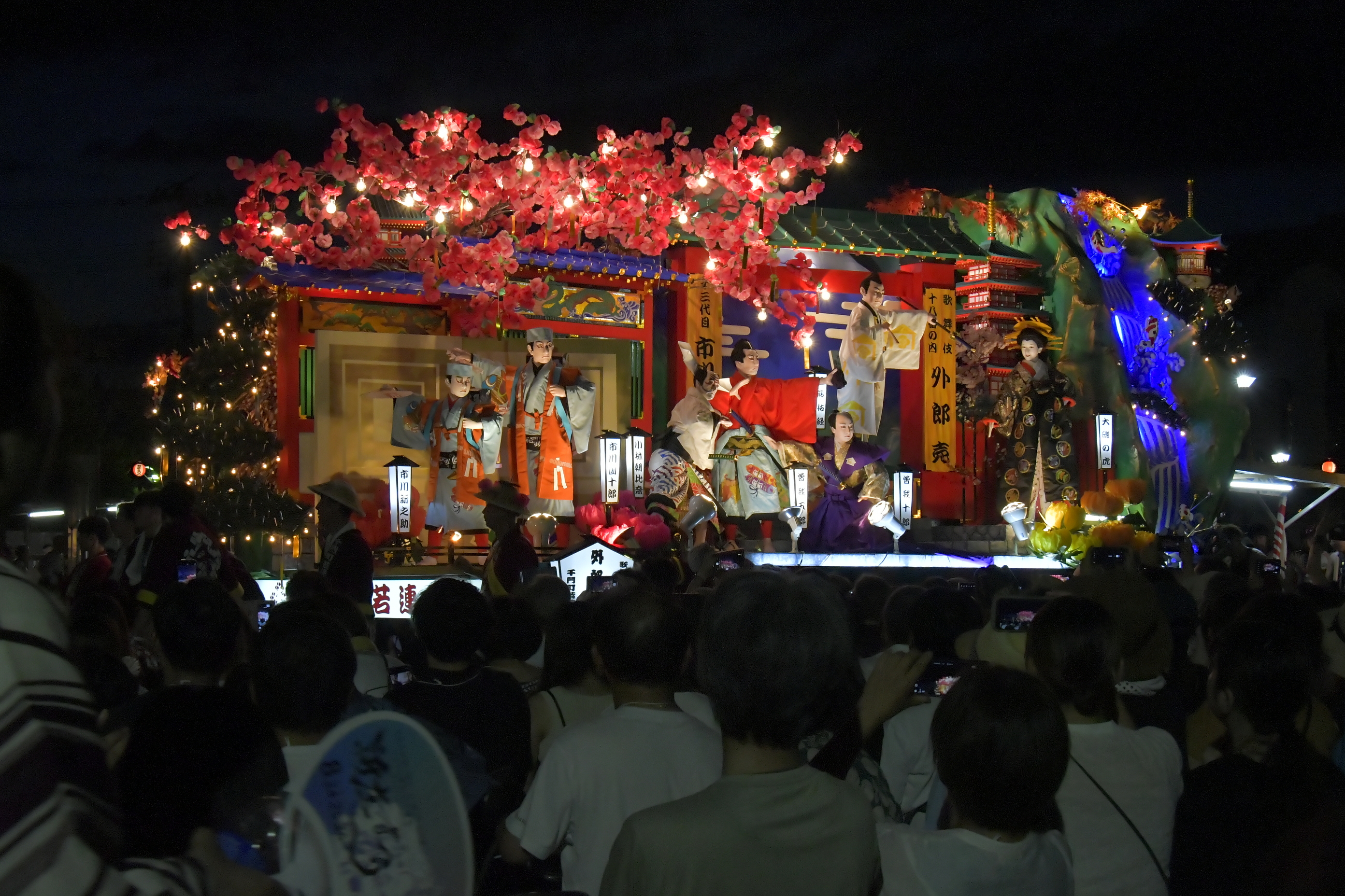 24日は「宵まつり」、25日は「本まつり」、26日は「後まつり」と呼ばれ、それぞれで異なる催しが行われます。最大の見どころは、絢爛豪華な山車(やたい)行列。各町内で一台ずつ、合計20台ほどの個性的な山車が勢揃いし、市内を練り歩く姿は圧巻です。他にも、神輿渡御行列(みこしとぎょぎょうれつ)や民俗芸能「鹿子踊」など、藩政時代をしのばせる勇壮で華麗な歴史絵巻が繰り広げられます。