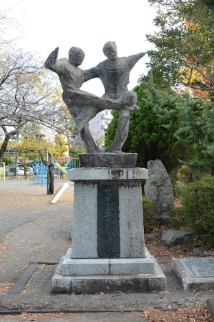 「サッカー少年団発祥の地」と刻まれた記念像