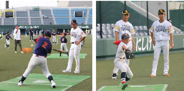 小中学生を対象にした野球教室や学校訪問、ホークスジュニアとの交流試合など、プロ野球選手とのふれあいを通じて、子どもたちの夢や目標を育んでいます。また、外国人選手との交流も行われており、国際的な視野を養う機会にもなっています。