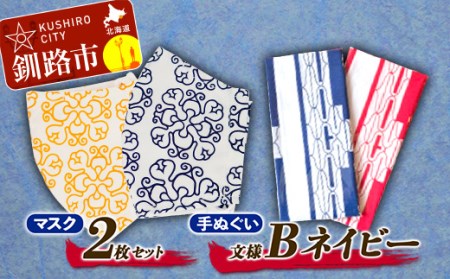 アイヌ 文様 マスク 2枚&手ぬぐい B ネイビー F4F-1814