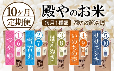 山形県鶴岡市 【定期便10か月】【令和4年産】殿やのお米5種類(毎月1種類 5kg×10ヶ月) 100,000円 出典:ふるなび