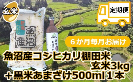 新潟県小千谷市 r05-073-001 【定期便・毎月/6回】魚沼産コシヒカリ・棚田米【玄米】3kg+黒米あまざけ1本×6回(毎月お届け)(佐藤農場) 73,000円 出典:ふるなび