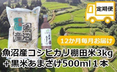 新潟県小千谷市 r05-156-001 【定期便・毎月/12回】魚沼産コシヒカリ・棚田米【白米】3kg+黒米あまざけ1本×12回(毎月お届け)(佐藤農場) 156,000円 出典:ふるなび