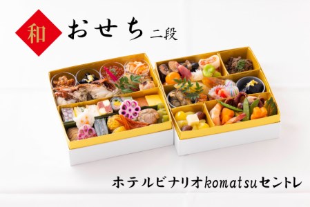 石川県小松市 050037. 【2021年12月31日お届け】ホテルビナリオKOMATSUセントレ ミニおせち二段重 50,000円 出典:ふるなび