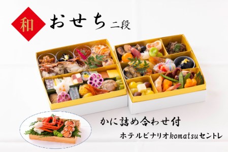 石川県小松市 107001. 【2021年12月31日お届け】ホテルビナリオKOMATSUセントレ おせち 和二段重 かに詰め合わせ付 107,000円 出典:ふるなび