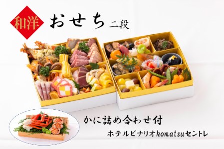 石川県小松市 120009. 【2021年12月31日お届け】ホテルビナリオKOMATSUセントレ おせち 和洋二段重 かに詰め合わせ付 120,000円 出典:ふるなび