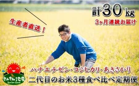 福井県坂井市 【先行予約】【令和5年産】定期便 ≪3ヶ月連続お届け≫ さんさん池見二代目のお米 3種食べ比べ定期便 10㎏×3回 計30㎏ 【2023年8月下旬以降順次発送予定】 [C-0264] 36,000円 出典:ふるなび