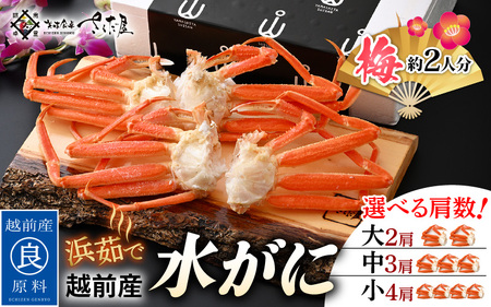 福井県越前町 【先行予約】【期間限定】浜茹で 越前産 水がに ≪梅セット≫ 2~4肩 (約2人前) 脱皮したてのずわいがに【福井県 越前町 かに カニ 蟹 ずわいがに ズワイガニ 雄 ズボガニ 水ガニ かに足 冷蔵 越前ガニ 越前かに 越前カニ】【小サイズ4肩】【2024年2月20日以降 順次発送予定】 [e04-x017_c] 15,000円 出典:ふるなび