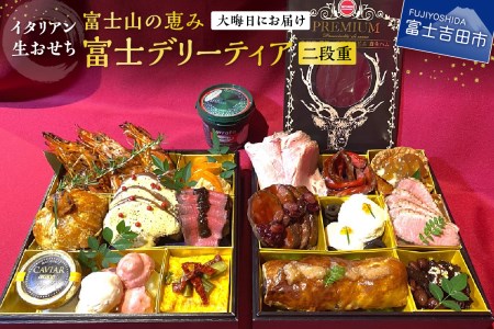 山梨県富士吉田市 【生おせちを大晦日にお届け】イタリアン生おせち 富士山の恵み「富士デリーティア 二段重」 (2022・冷蔵・31日お届け) 130,000円 出典:ふるなび
