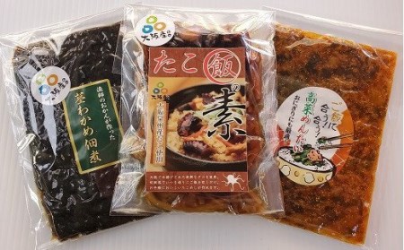 大阪府阪南市 惣菜3点セット(1)【たこも(たこ飯の素)・茎わかめ佃煮・高菜めんたい 各1袋】_NA74 7,000円 出典:ふるなび