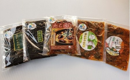 大阪府阪南市 惣菜5点セット(1)【たこも(たこ飯の素)・茎わかめ佃煮・わかめ佃煮・高菜めんたい・茎わかめんたい 各1袋】_NA76 11,000円 出典:ふるなび