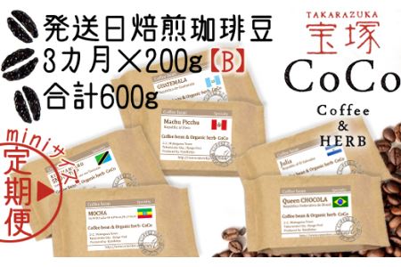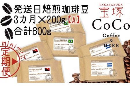 兵庫県宝塚市 【宝塚】miniサイズ3ヶ月定期便【A】当日自家焙煎珈琲3種 計600g【細挽き】 10,000円 出典:ふるなび
