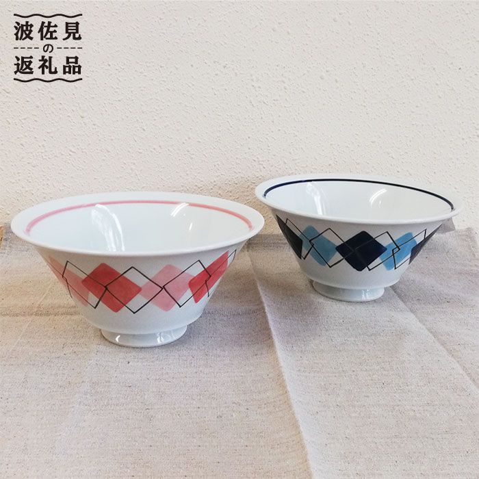 【波佐見焼】イケメン丼 ペアセット アーガイル ブルー×レッド 【くらわんか】 [AA45]
