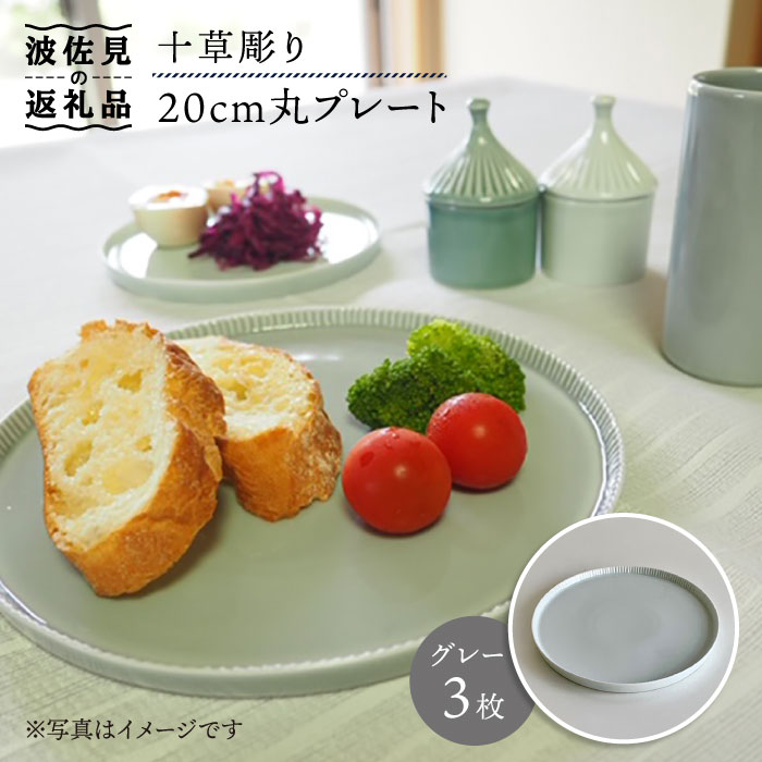 【波佐見焼】十草彫り 20cm丸プレート(グレー) 3枚セット【永泉】 [MC48]