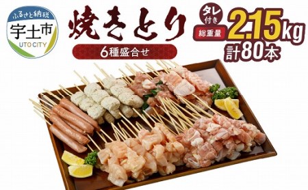 熊本県宇土市 F103-8 80本 焼きとり 6種盛合せ 総重量2150g 12,000円 出典:ふるなび
