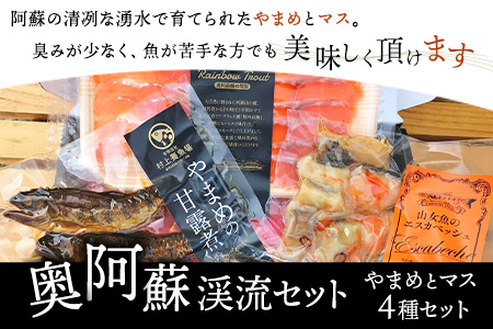 熊本県南阿蘇村 奥阿蘇渓流セット やまめとマス 4種セット《30日以内に順次出荷(土日祝除く)》有限会社村上養魚場 山女魚 スモーク 鱒 エスカベッシュ 甘露煮 川魚 臭くない 食べやすい 10,000円 出典:ふるなび