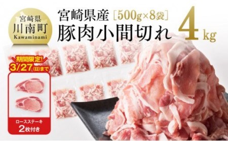 宮崎県川南町 【3月27日までの期間限定】宮崎県産 豚肉 こま切れ 4.0kg + ロースカツ2枚付き 合計4.3kg 【九州産 小間切れ 便利 真空パック 食べやすい トンカツ 肉 豚肉 ぶた肉 】 10,000円 出典:ふるなび