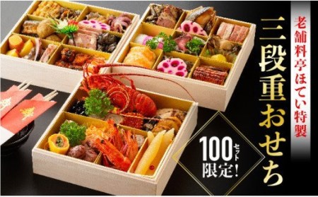 宮崎県川南町 人気料亭「ほてい」の 特製三段重おせち【数量限定 期間限定 おせち 自然解凍 老舗の味 高級食材 お正月 おせち料理 お取り寄せ 惣菜 川南町 送料無料】 50,000円 出典:ふるなび