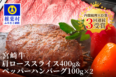 宮崎県椎葉村 宮崎牛肩ローススライス【400g】&宮崎牛100%使用 ぺっぱーハンバーグ【100g×2】 15,500円 出典:ふるなび