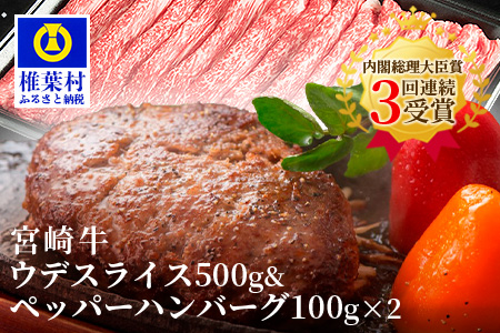 宮崎県椎葉村 宮崎牛ウデスライス【500g】&宮崎牛100%使用 ぺっぱーハンバーグ【100g×2】 15,500円 出典:ふるなび