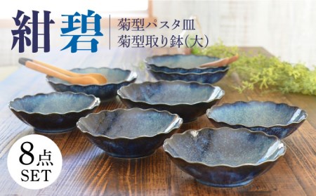 岐阜県土岐市 【美濃焼】紺碧 菊型パスタ皿×4枚・大きめの取り鉢×4枚 計8枚セット【株式会社カクニ】食器 青 器 セット 家族 おもてなし 美濃焼 日本製 おしゃれ レンジ対応 食洗機対応 送料無料[MEF00 14,000円 出典:楽天ふるさと納税